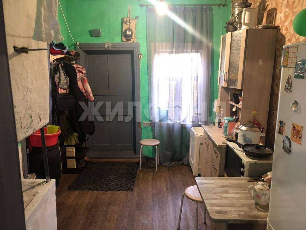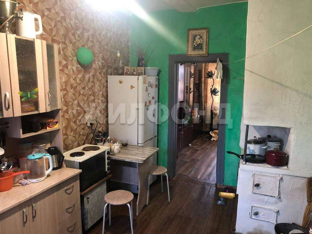 Квартира расположена на 2-м этаже брусового 2-этажного дома, печное отопление (1 ведро в сутки) , на полу линолеум, стены оштукатурены, частично с обоями, высокие потолки оштукатурены.